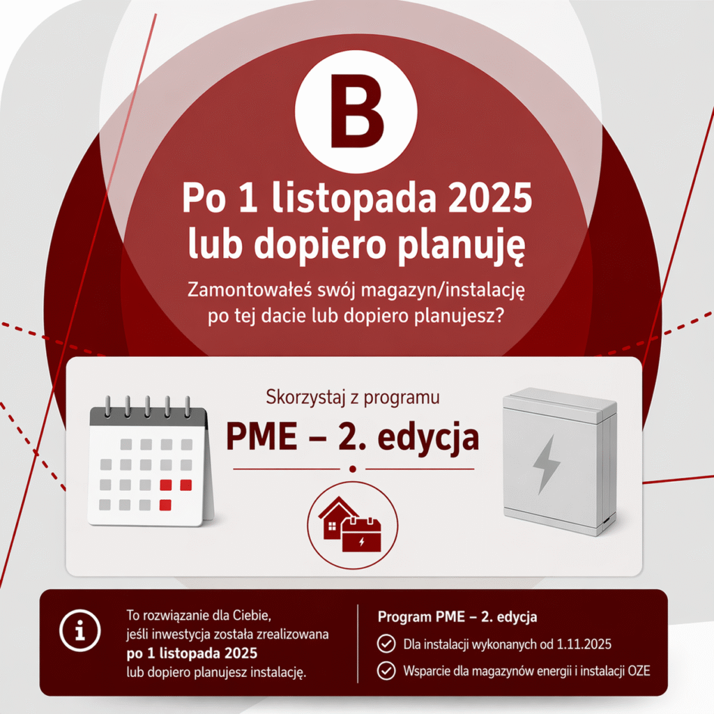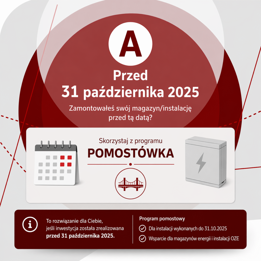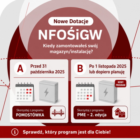 W 2026 roku wsparcie dla magazynów energii i instalacji OZE zostało podzielone na dwa różne programy, zależnie od momentu montażu instalacji lub magazynu. Dlatego najważniejsze pytanie brzmi: kiedy została wykonana Twoja inwestycja? Jeśli montaż został zrealizowany przed 31 października 2025 roku, obowiązuje ścieżka związana z programem pomostowym. Jeśli natomiast instalacja została wykonana po 1 listopada 2025 roku albo dopiero planujesz inwestycję, właściwym rozwiązaniem będzie nowy program Przydomowe Magazyny Energii – 2. edycja. W tej sekcji pomagamy szybko ustalić, do którego programu się kwalifikujesz i gdzie szukać właściwych informacji.